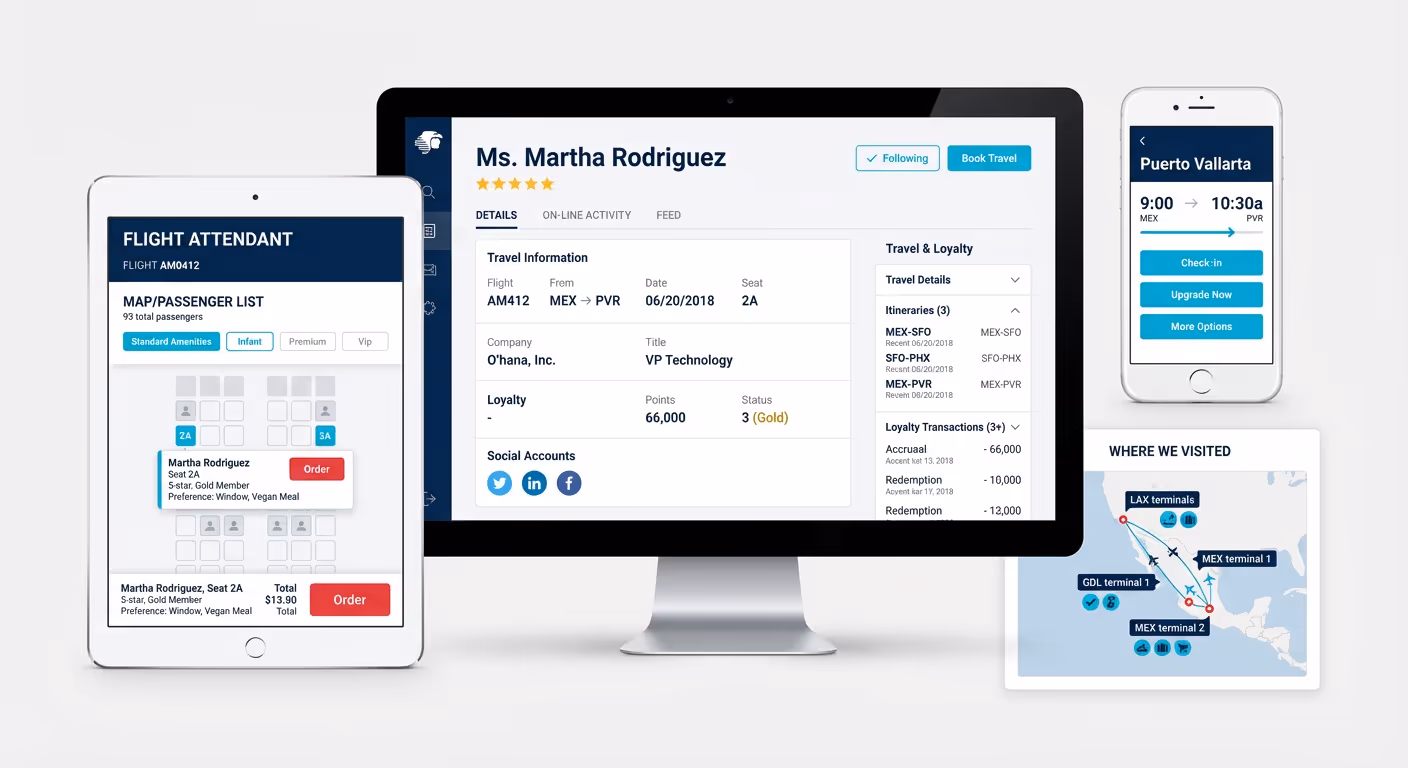 But the system was only useful if staff could actually use it. We designed iPad interfaces for flight attendants showing passenger profiles, meal preferences, and service history. Gate agents could see connection risks and proactively rebook. Call center staff finally had context when a passenger called.